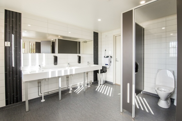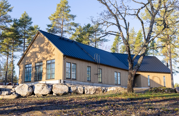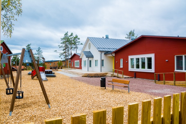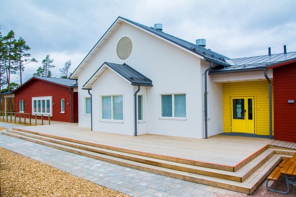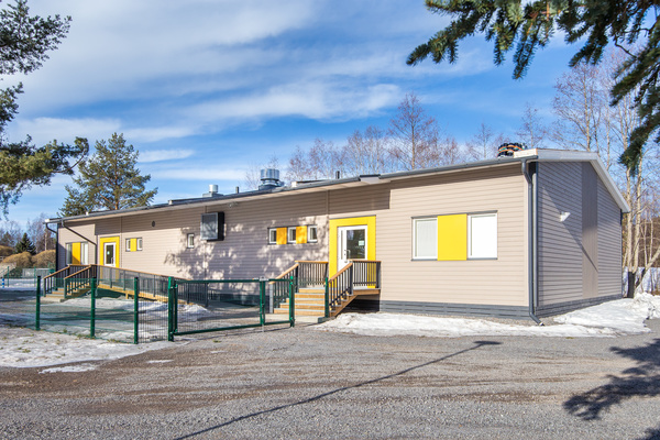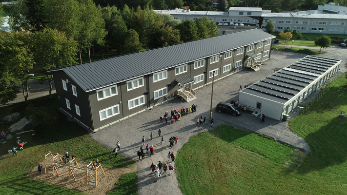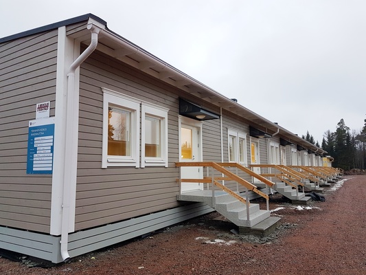 Fabrikstillverkat CLT-modulskola som evakueringsbyggnad.